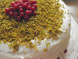 By hand, bread the pistachios for the topping into ¼ inch pieces. Sprinkle over the top of the cake.